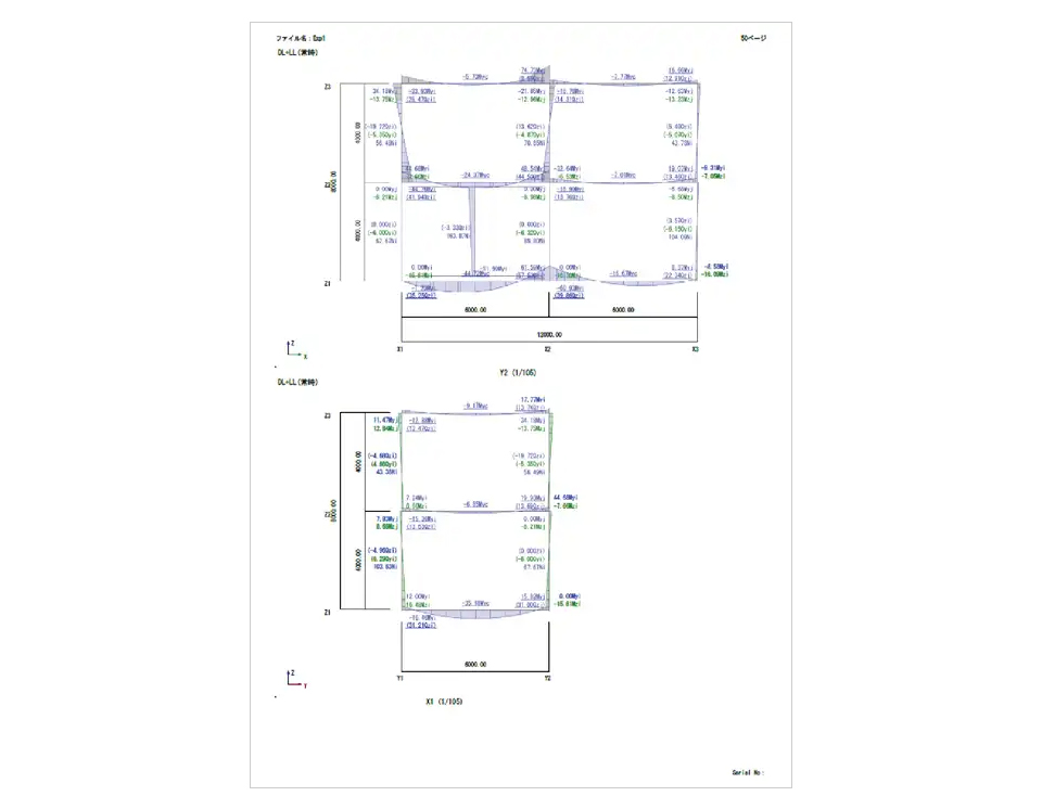 入力データ、弾性応力解析結果、固有値解析結果、偏心率・剛性率計算結果、断面計算結果を図表に富んだグラフィック形式で一括出力します。CSV形式のファイルに出力して、表計算ソフトウェア(Excelなど)で利用できます。