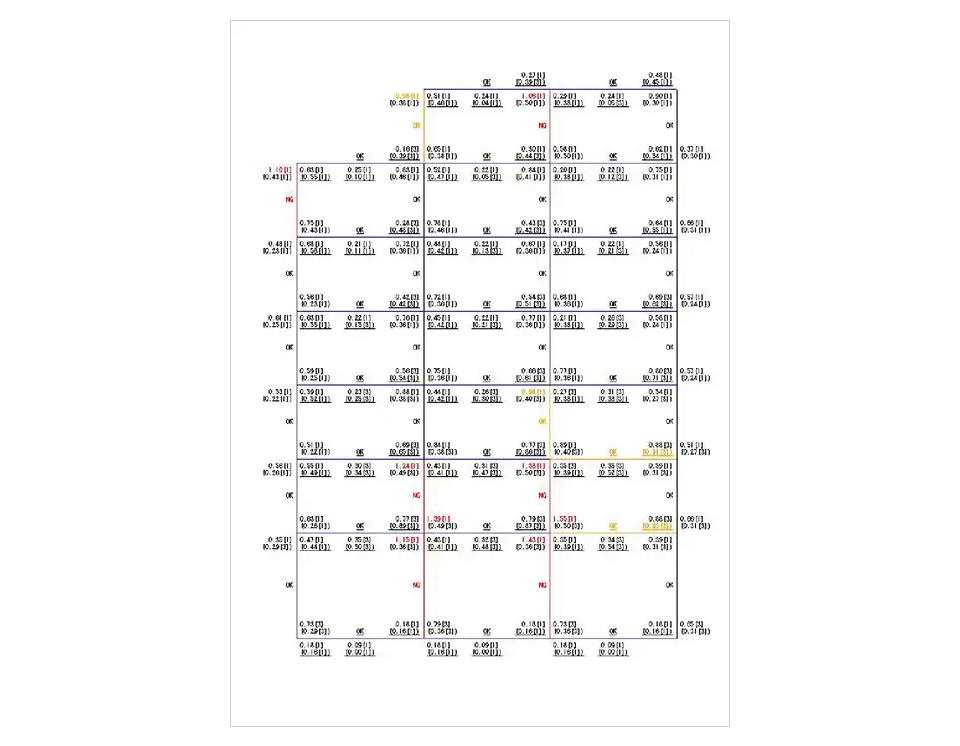 断面計算結果を検定比図(検定計算結果)、算定図(算定計算結果)として出力できます。検定比図では、表示する検定比の最小値や検定比の数値の大きさに応じた表示色を指定できるので、NGとなる部材や後少しでNGとなる部材を一目で確認できます。